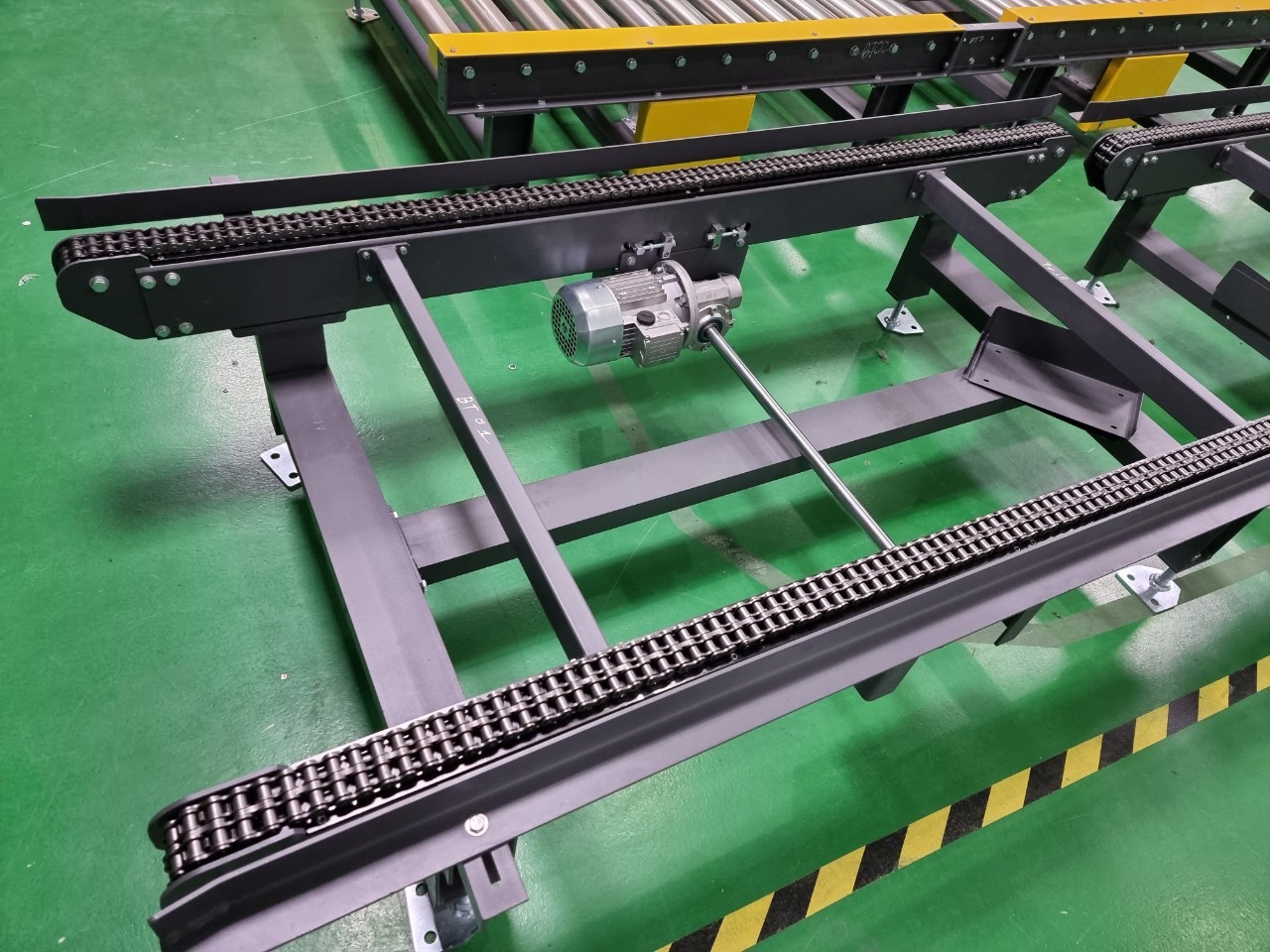 Băng tải xích có thể tải được các loại hàng hóa nặng như hộp, thùng chứa công nghiệp, pallet. Các băng tải này có thể là chuỗi đơn hoặc chuỗi kép trong cấu hình.